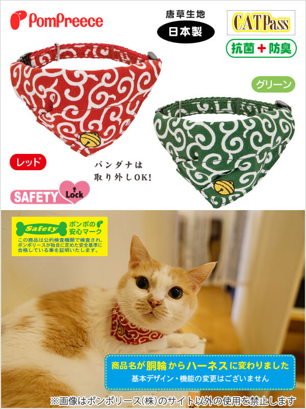 – 唐草花紋面料日本製,質優耐用 – 使用貓用安全扣,猛力拉扯會解開,減低窒息風險 – 附D形金屬扣,可隨意繫上裝飾或名牌 – 可調節長度