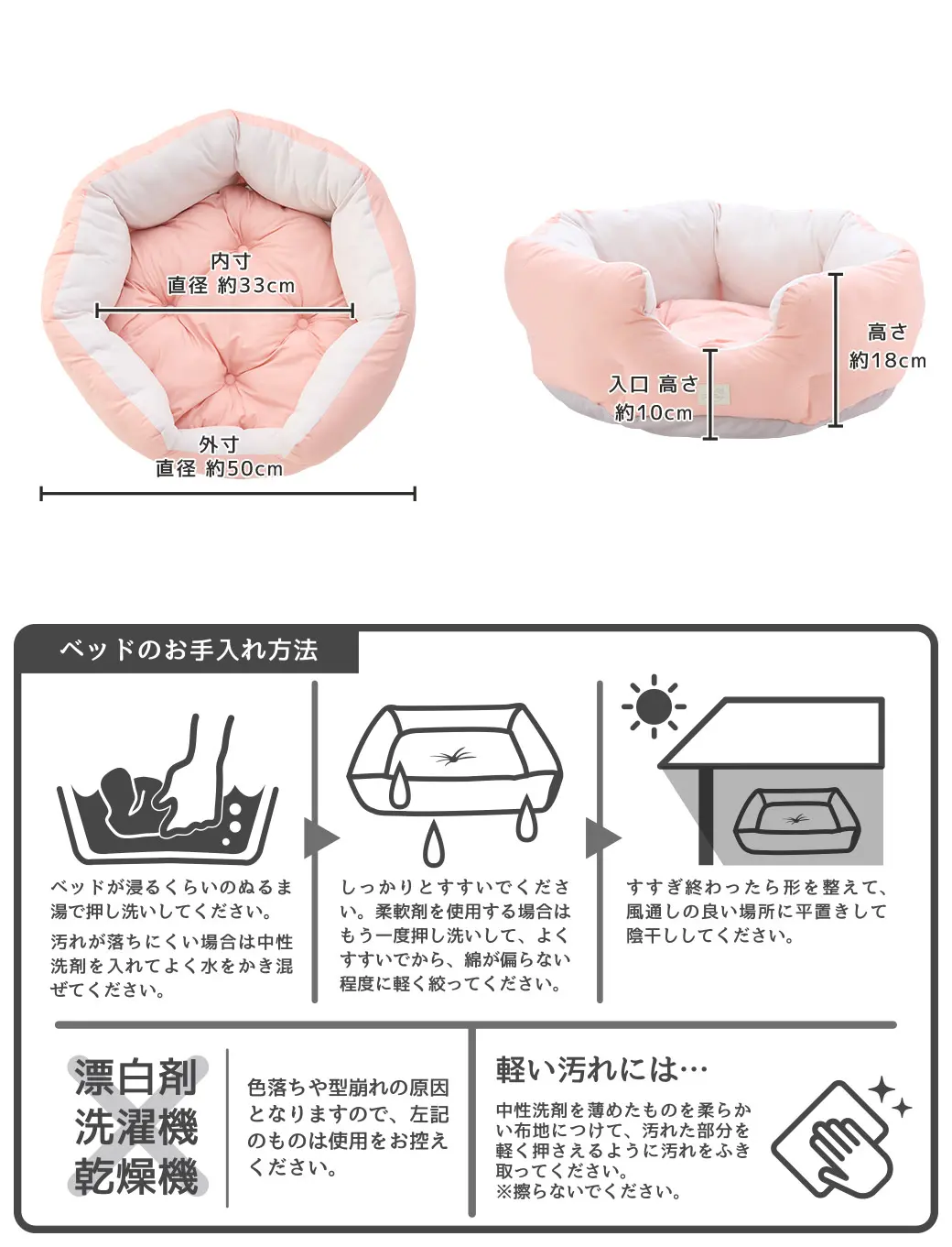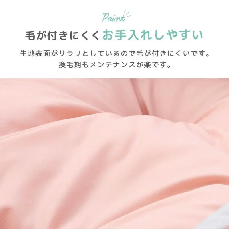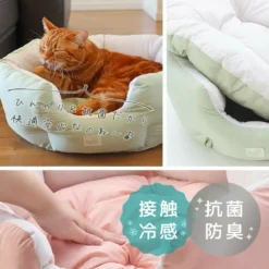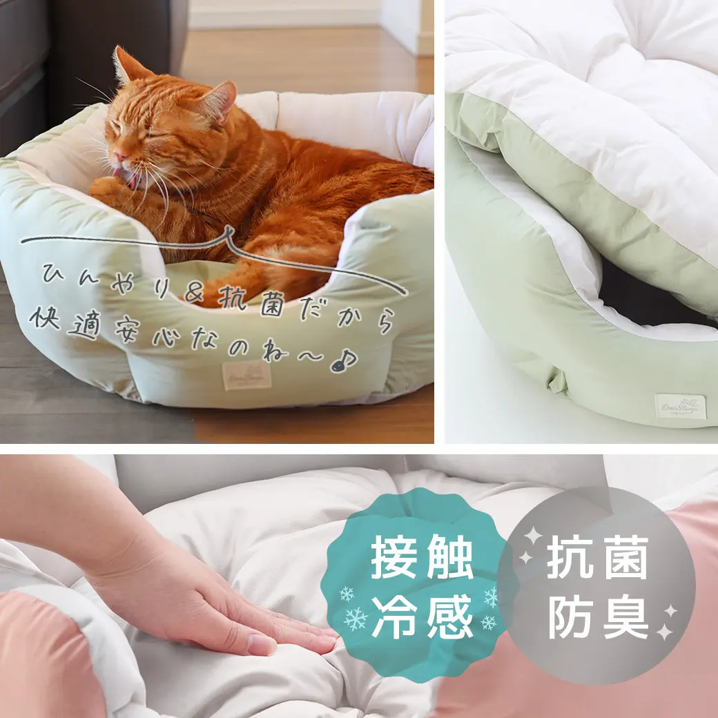 圓形寵物床,完全環繞牆壁。內側(灰色材質)採用觸感涼爽的布料,並經過抗菌除臭處理,進一步提升舒適度。