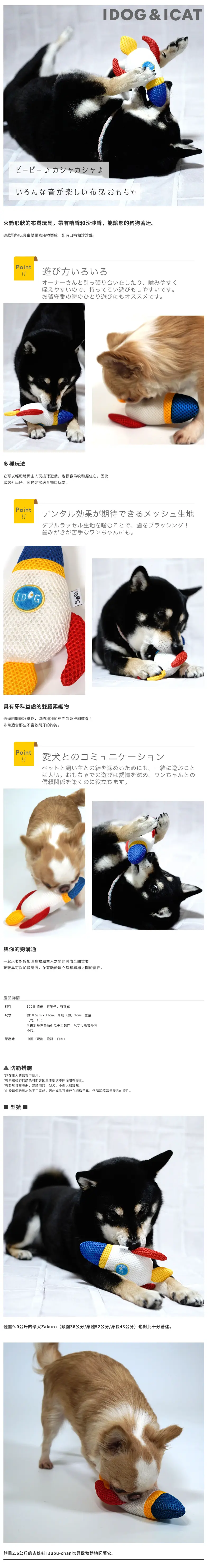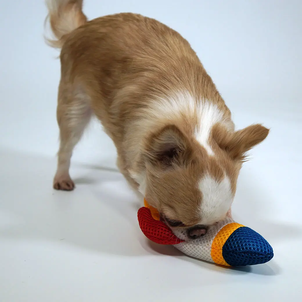 以透氣網布製成,有助潔齒,內藏響笛,玩具形狀也很適合玩拔河。