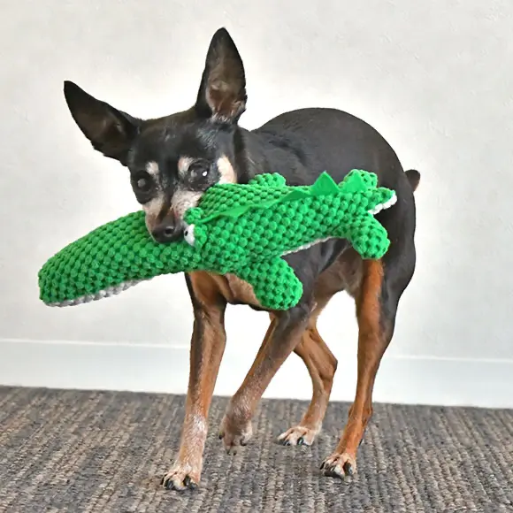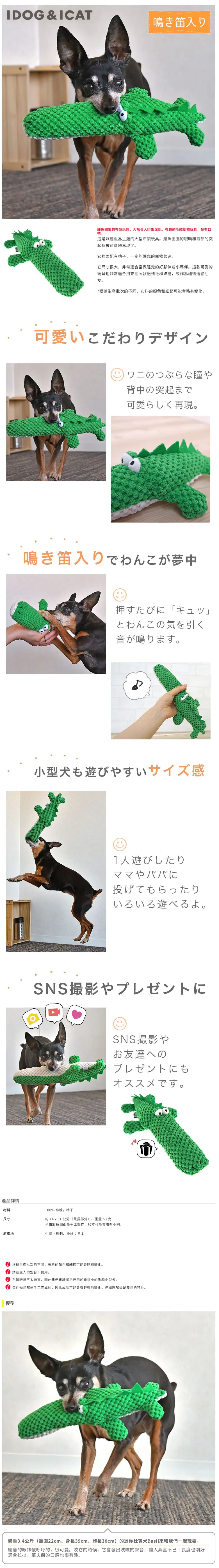 以鱷魚為主題的大型布製玩具,鱷魚圓圓的眼睛和背部的凹凸感都能可愛地呈現出來;內藏響笛,令狗狗著迷。